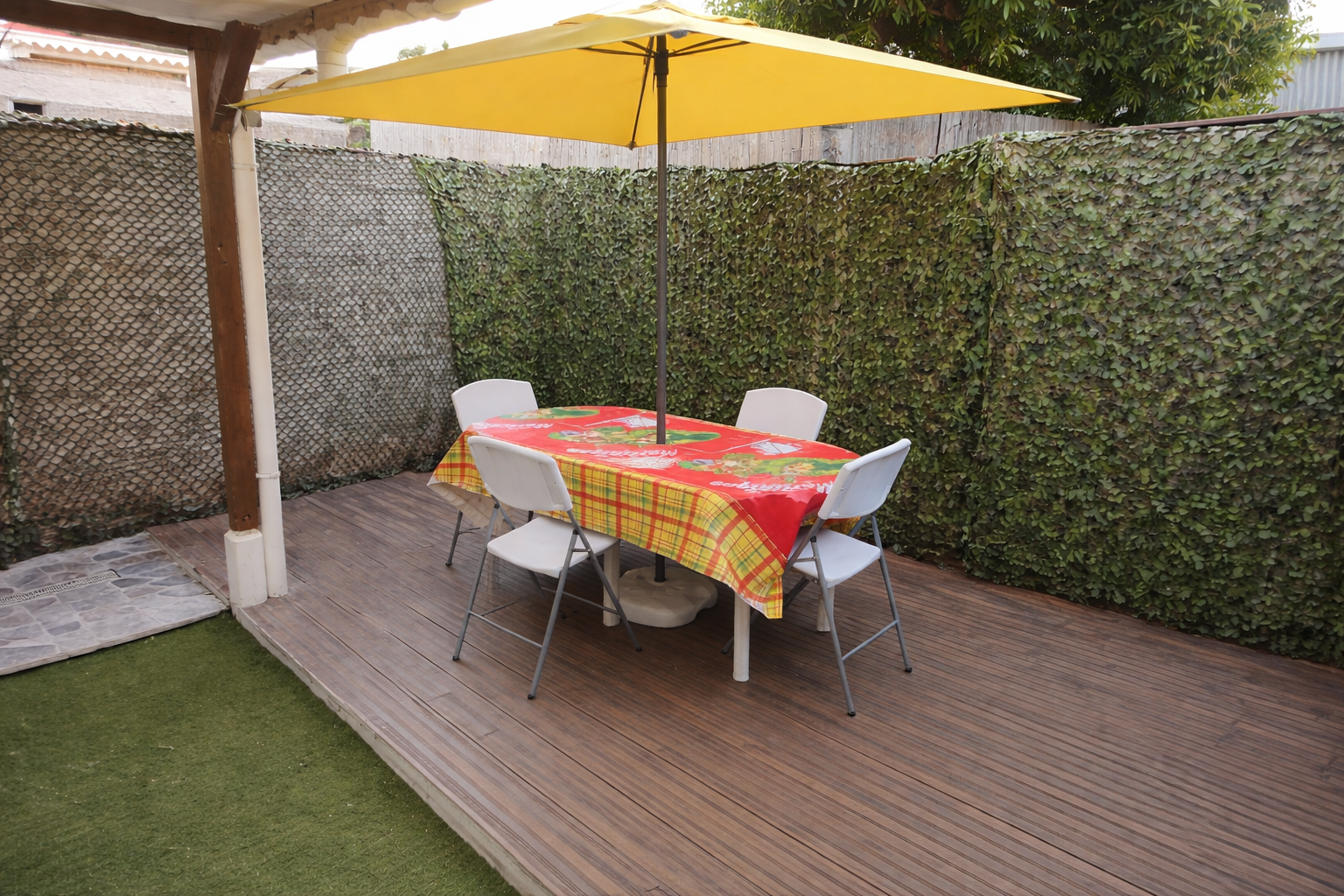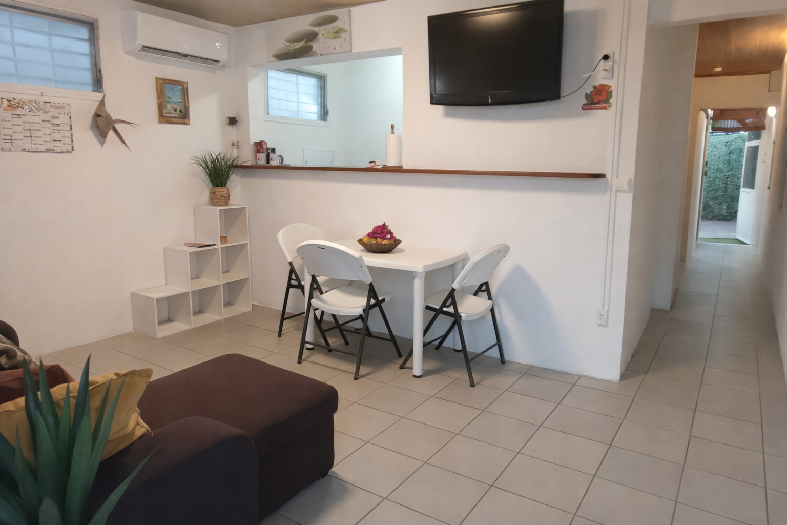 Profitez d'un confort simple et fonctionnel : un séjour équipé et climatisé rafraîchissant l'ensemble du logement, une chambre avec ventilateur en complément pour un sommeil optimal, télévision à écran plat avec accès TNT, et une cuisine équipée pour vos repas quotidiens. À l'extérieur, une terrasse privative à l'arrière avec douche vous attend, idéale après une sortie plage. Dès votre arrivée, un accueil soigné vous attend avec un planteur, café local, jus de fruits frais et eau minérale d'un industriel local, une délicate attention de bienvenue pour votre séjour à la Maison du Soleil..